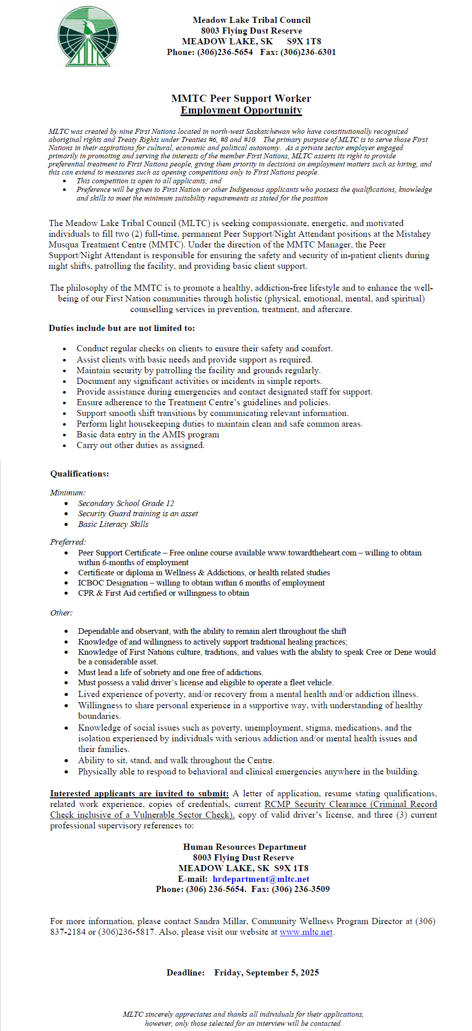 Mistahey Musqua Treatment Centre MMTC Support & Cook (MLTC)