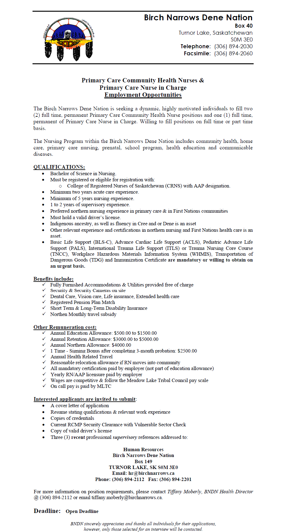 Primary Care Community Health Nurses – Birch Narrows Dene Nation (MLTC)
